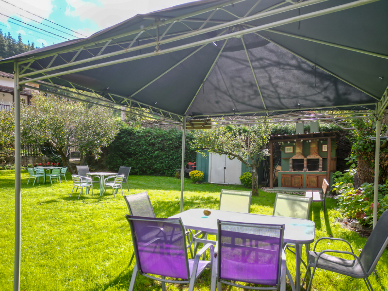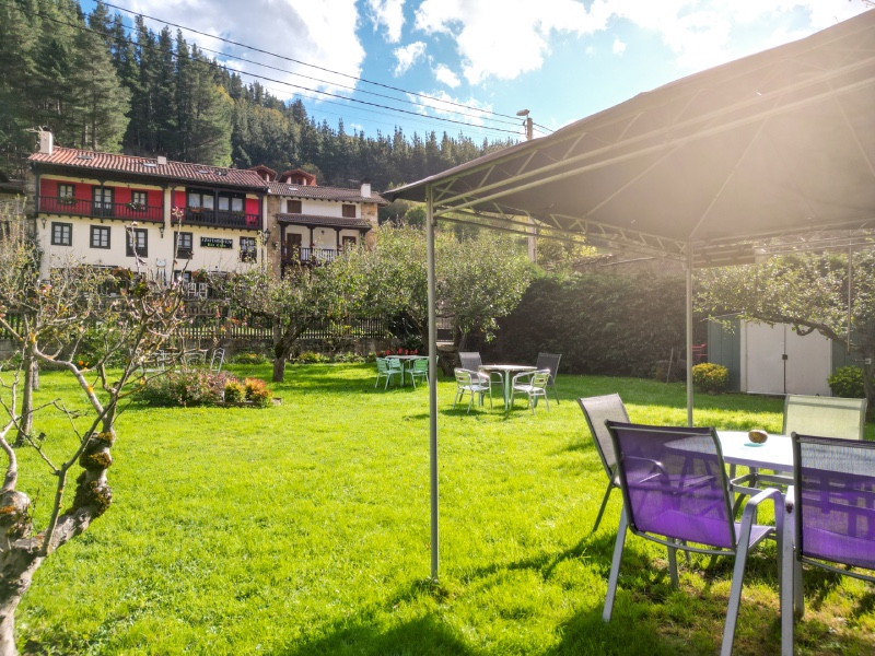 Jardín de uso común para los huéspedes, con bajada directa al río y zona de exterior con dos barbacoas
